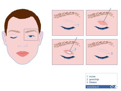 Hierbij plaatsen we een gewichtje in uw bovenste ooglid, waardoor het ooglid zwaarder wordt en makkelijker sluit. Implantatie gebeurt onder plaatselijke verdoving via een snede die precies in de plooi van uw ooglid ligt.