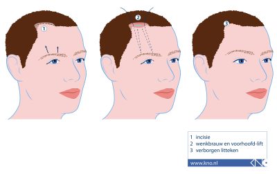 Bij deze ingreep worden zowel uw voorhoofd als wenkbrauw omhoog getrokken. U krijgt een aantal snedes achter de haargrens, waar het minder opvalt.