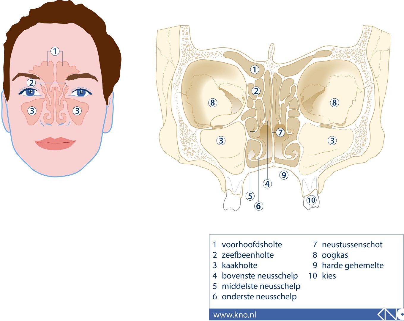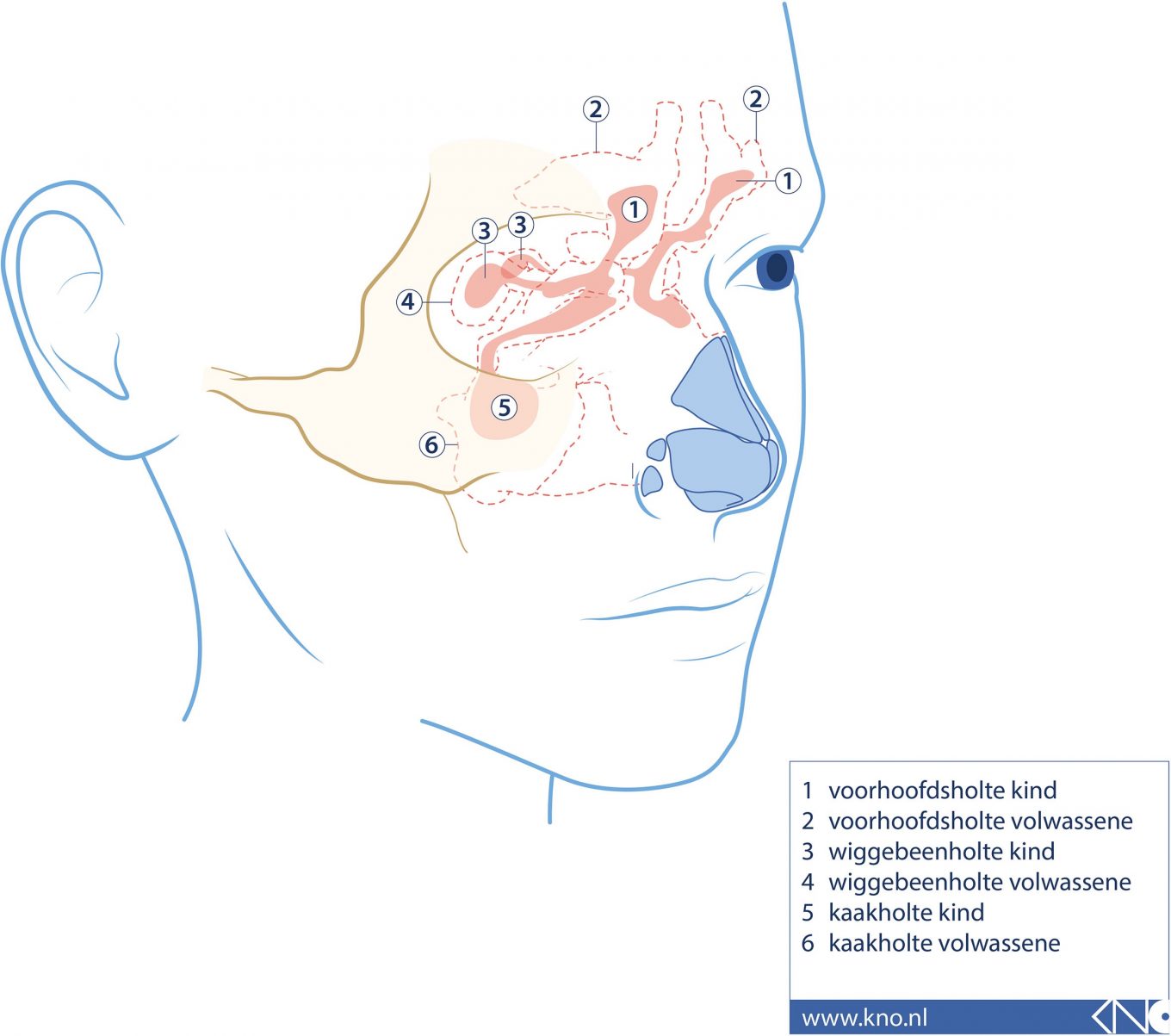 Bij kinderen is de aanleg van de neusbijholten nog gaande. Op dit plaatje ziet u het verschil.