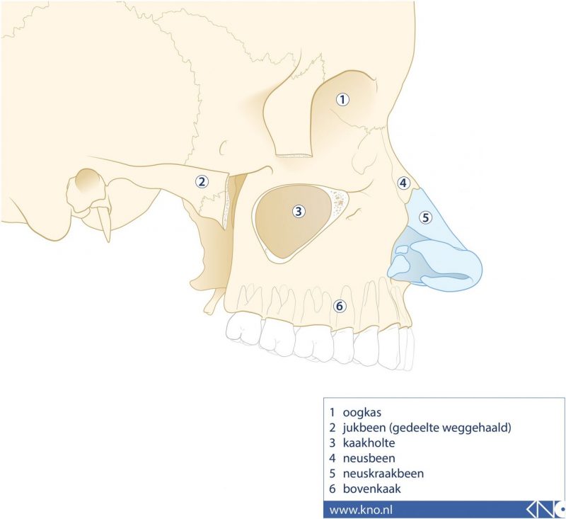 De twee kaakholten (sinus maxillares; in alle plaatjes: 3) bevinden zich achter de wangen. Ook de kaakholten staan via de zeefbeenholten met de neus in verbinding.