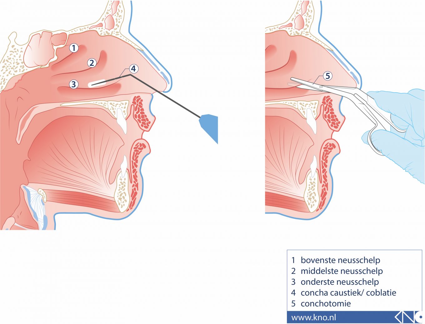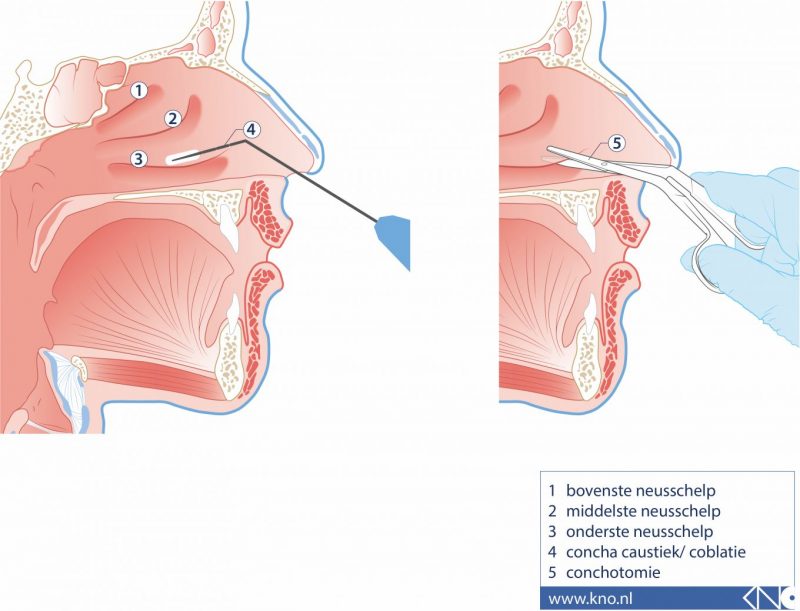 Het is ook mogelijk dat de KNO-arts adviseert met een schaar, in de lengterichting, een strook neusschelpslijmvlies (5 in het plaatje) met neusschelpbot te snijden (conchotomie).